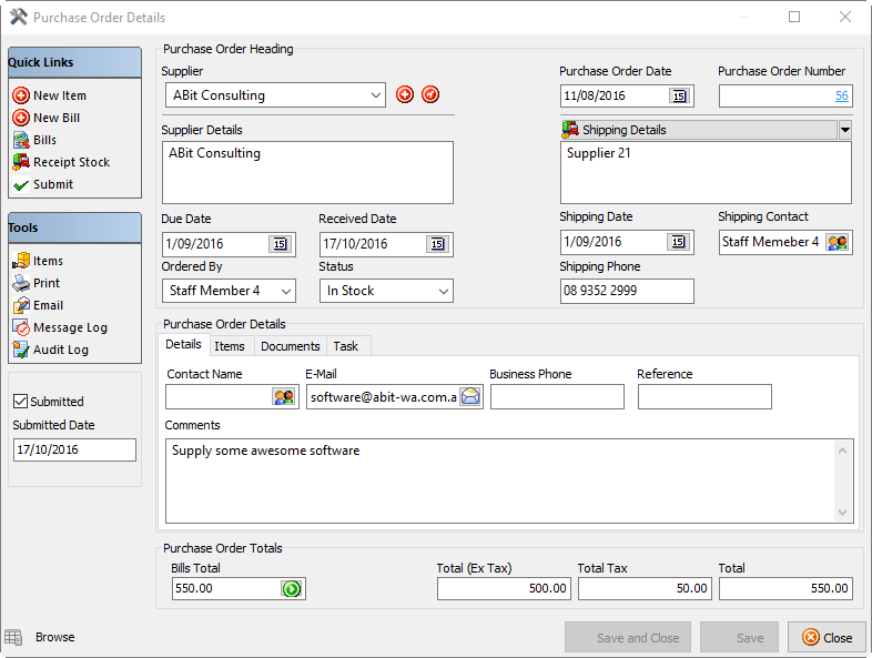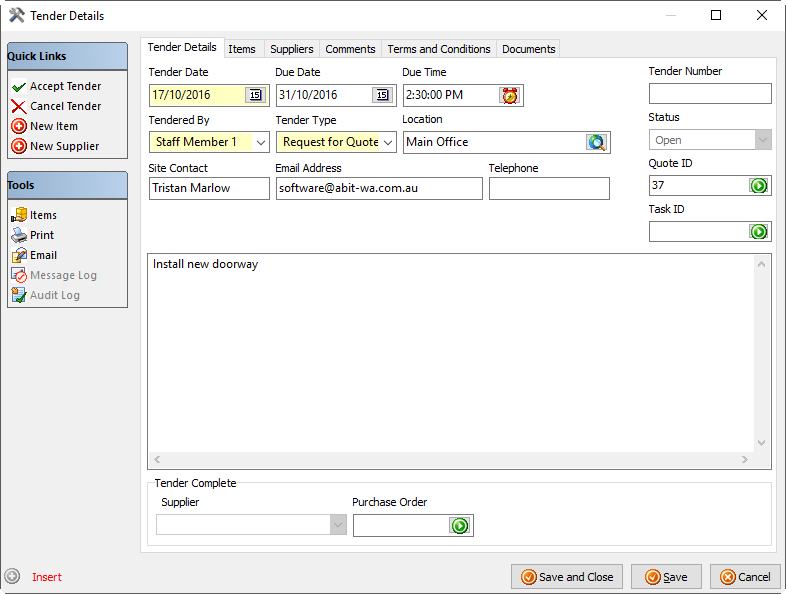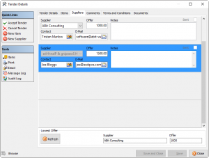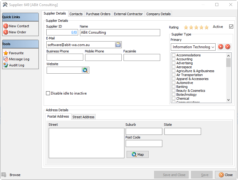 Maintain your suppliers for Purchase Orders, External Contractor Work and Tenders.